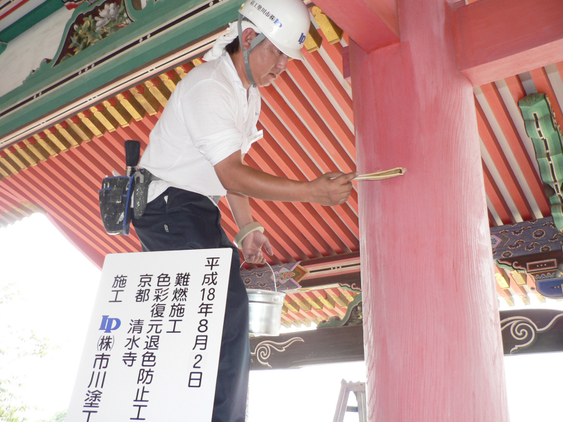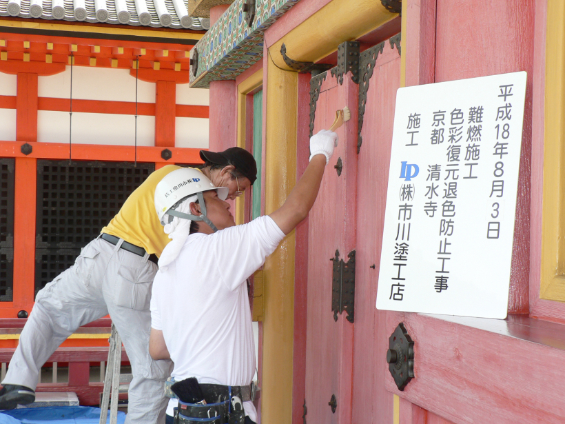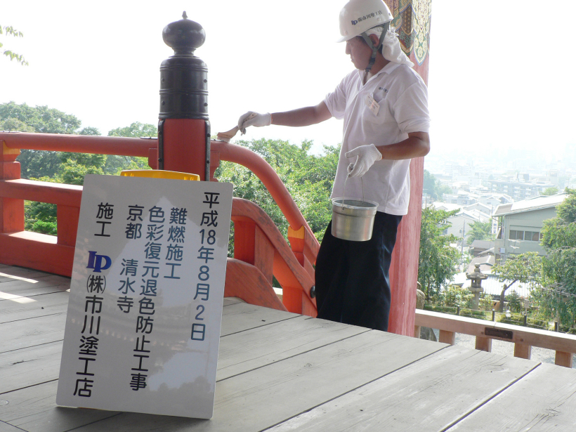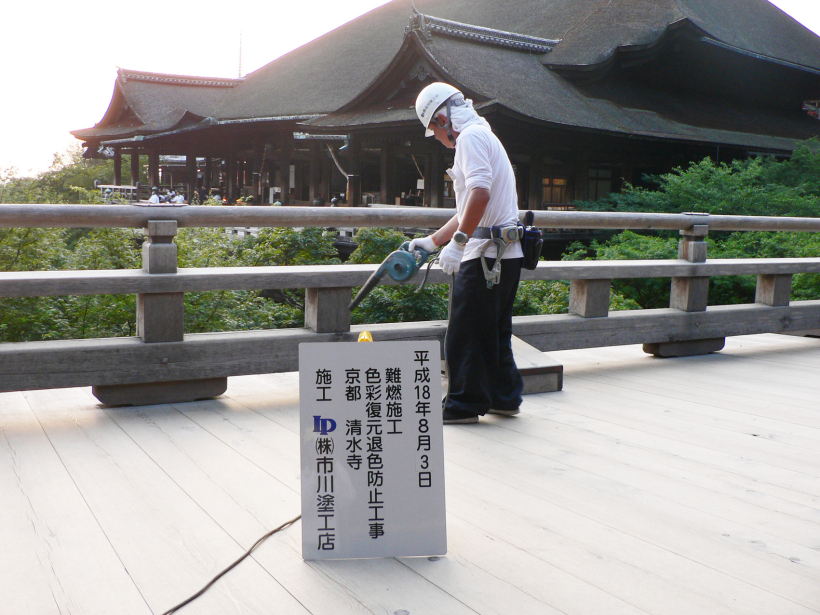 清水寺 京都 清水寺のコーティングをしました。 京都市・清水寺にて、木材劣化防止のため薬剤コーティングをしました。 ハイヒールなどで踏まれ、くぼみが目立つようになったとのことで、私たちがコーティングをさせていただきました。 床板表面の強化のほか、木材の劣化を防ぐための紫外線カットや水をはじく効果のある薬剤を使うなど、丁寧に仕上げました。