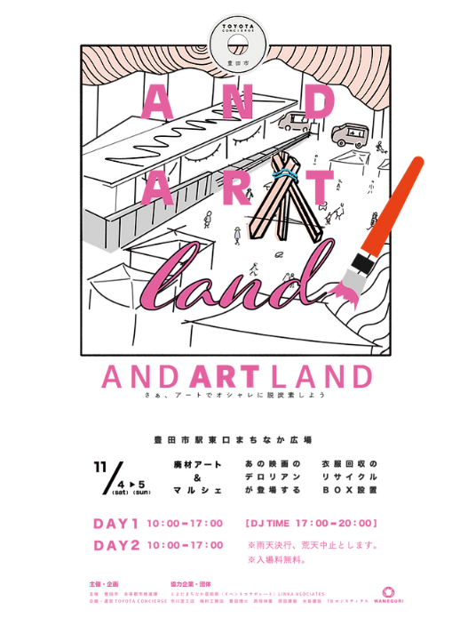イベントに廃材を提供しました。 豊田市が廃材活用アートと衣服回収で若い世代に脱炭素化を発信するイベント「AND ART LAND」にとよたSDGsパートナーとして、弊社の廃材を提供させて頂きました。 【イベント詳細】 〇日時 令和5年11月4日・5日 午前10時~午後17時 〇場所 豊田市駅東口まちなか広場 〇入場料 無料